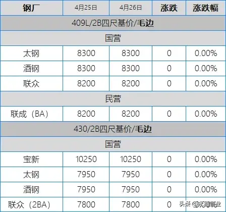 目前市場主流報價:410S熱軋黑皮在6050-6150元/噸;430熱軋黑皮在6650-6750元/噸,其中個別高位在6800元/噸左右;太鋼/酒鋼430/2B(毛)在7950-8000元/噸;聯(lián)眾430/2BA(毛)在7750-7800元/噸;宏旺430/2BA(毛)在7750-7800元/噸;甬金430/BA(毛)在8500元/噸左右;上克430/BA(毛)在8400元/噸左右;宏旺430/BA(毛)在8150-8200元/噸;瑞鋼430/2BA(毛)在7700-7800元/噸;聯(lián)成430/BA(毛)在8200元/噸左右。