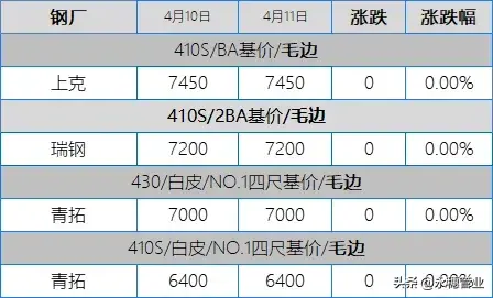 目前市場(chǎng)主流報(bào)價(jià):410S熱軋黑皮在6100-6150元/噸,個(gè)別在6200元/噸左右;430熱軋黑皮在6700-6800元/噸;太鋼/酒鋼430/2B(毛)在8000-8100元/噸;聯(lián)眾430/2BA(毛)在7800-7900元/噸;宏旺430/2BA(毛)在7800-7850元/噸;甬金430/BA(毛)在8450元/噸左右;上克430/BA(毛)在8350元/噸左右;宏旺430/BA(毛)在8200-8250元/噸;瑞鋼430/2BA(毛)在7800元/噸左右;聯(lián)成430/BA(毛)在8250元/噸左右。