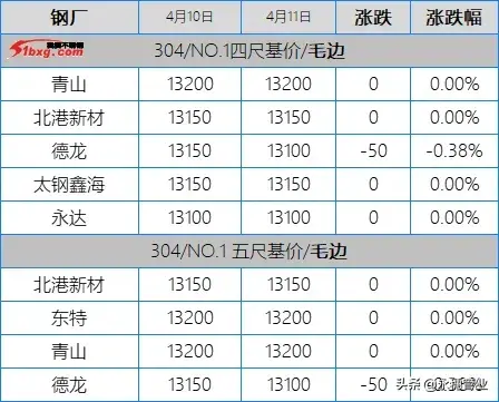 今日,青山代理報價4-5月期貨,鼎信304冷軋窄帶13200元/噸,30478冷軋窄帶12700元/噸,304熱軋大板13230元/噸。