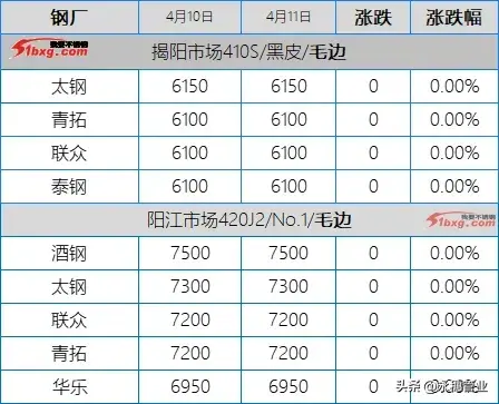 目前市場主流報價:410S熱軋黑皮在6100-6150元/噸,個別在6200元/噸左右;430熱軋黑皮在6700-6800元/噸;太鋼/酒鋼430/2B(毛)在8000-8100元/噸;聯(lián)眾430/2BA(毛)在7800-7900元/噸;宏旺430/2BA(毛)在7800-7850元/噸;甬金430/BA(毛)在8450元/噸左右;上克430/BA(毛)在8350元/噸左右;宏旺430/BA(毛)在8200-8250元/噸;瑞鋼430/2BA(毛)在7800元/噸左右;聯(lián)成430/BA(毛)在8250元/噸左右。