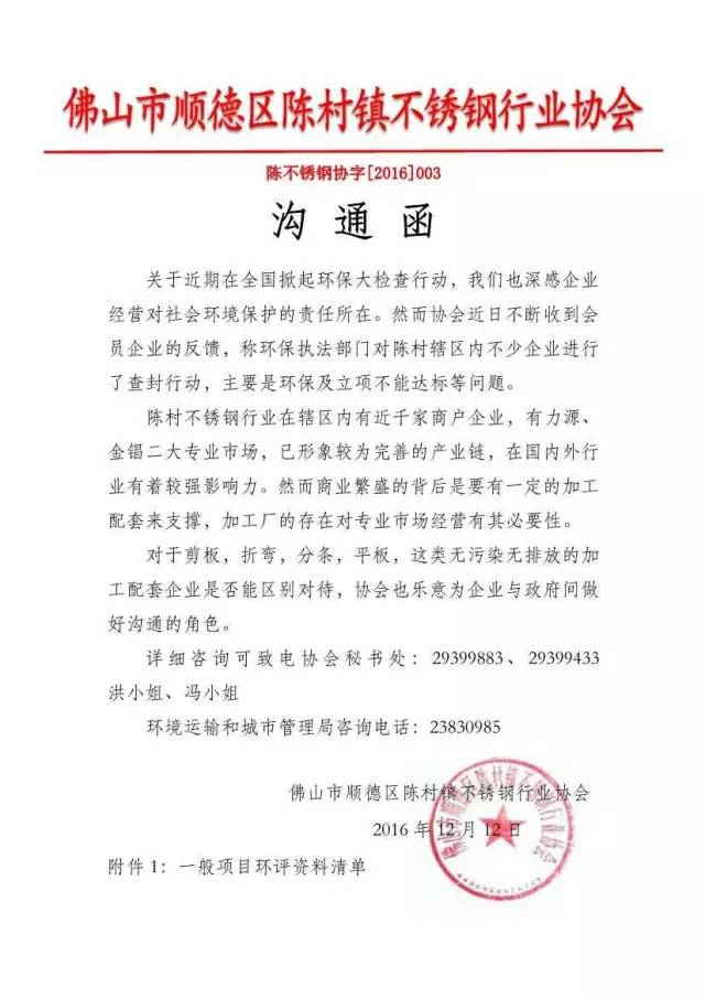 而就在本周初(12月12日),陳村鎮(zhèn)不銹鋼行業(yè)協(xié)會發(fā)溝通函,就金錩、力源兩大市場剪板、折彎、分條、平板等無污染無排放的加工配套企業(yè)與政府溝通,望能區(qū)別對待。