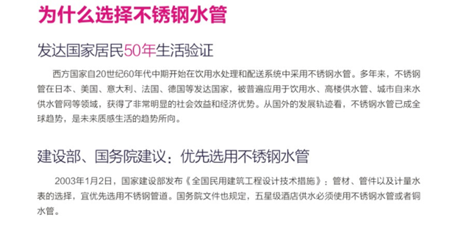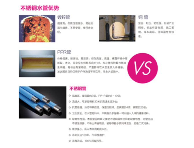 4.衛(wèi)生安全,在水管材質(zhì)中,不銹鋼是公認(rèn)可以植入人體的健康材料;