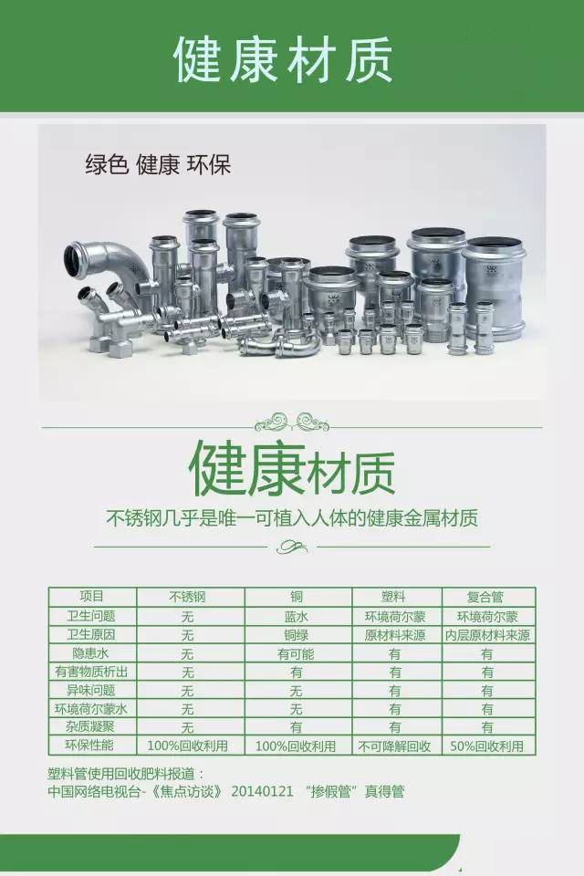 在這樣的大背景下,不銹鋼管材以其幾乎為零的漏水率和無與倫比的健康性被推上了城市供水系統(tǒng)和建筑物水管領域。研究并實際表明,一旦不銹鋼管材被廣泛運用,城市管網(wǎng)的漏水率將大幅度降低,建筑物水質將得到充分保障。薄壁不銹鋼管材以其所特有的安全性、可靠性、清潔性、耐用性、經(jīng)濟性和環(huán)保性等各方面突出優(yōu)勢,為保護水資源、改善水質、保護人們的健康和提高生活質量,保護人們的健康的提高生活質量,保護環(huán)境和促進社會經(jīng)濟的可持續(xù)發(fā)展發(fā)揮關鍵作用。